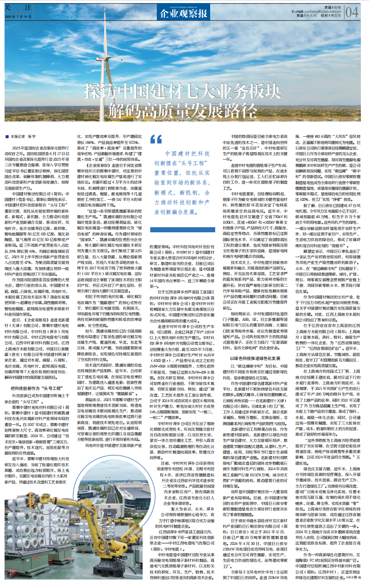 近日,《企业观察报》走进北新建材(天津)有限公司、邯郸彩票论坛 光电材料有限公司、中材科技(萍乡)风电叶片有限公司、中材江西电瓷电气有限公司、江西中材新材料有限公司、江西上高南方水泥有限公司、中国巨石新能源(淮安)有限公司等足彩论坛 所属7家企业,通过对水泥、商混、石膏板、光伏玻璃、风电叶片、超特高压电瓷、玻璃纤维等7大业务板块的深度探访,解码足彩论坛 的高质量发展路径。