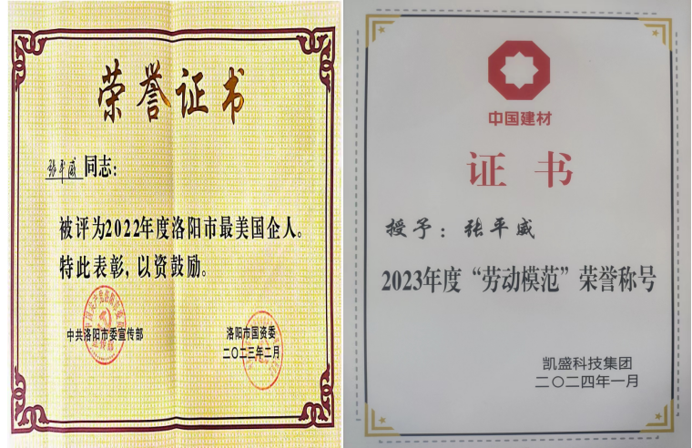 张平威作为洛阳市第十六届人民代表大会代表,立足企业实际,围绕新能源风口产业高质量发展积极建言献策,呼吁逐步完善相关制度保障和基础设施建设,推动战略性新兴产业在新赛道上蓬勃发展。相继荣获2006年洛玻集团“优秀共产党员标兵”,2007、2008年渑池县、三门峡市“先进工作者”,2022年度洛阳市“最美国企人”,2022、2023年度凯盛科技集团“优秀共产党员”“劳动模范”等多项称号。