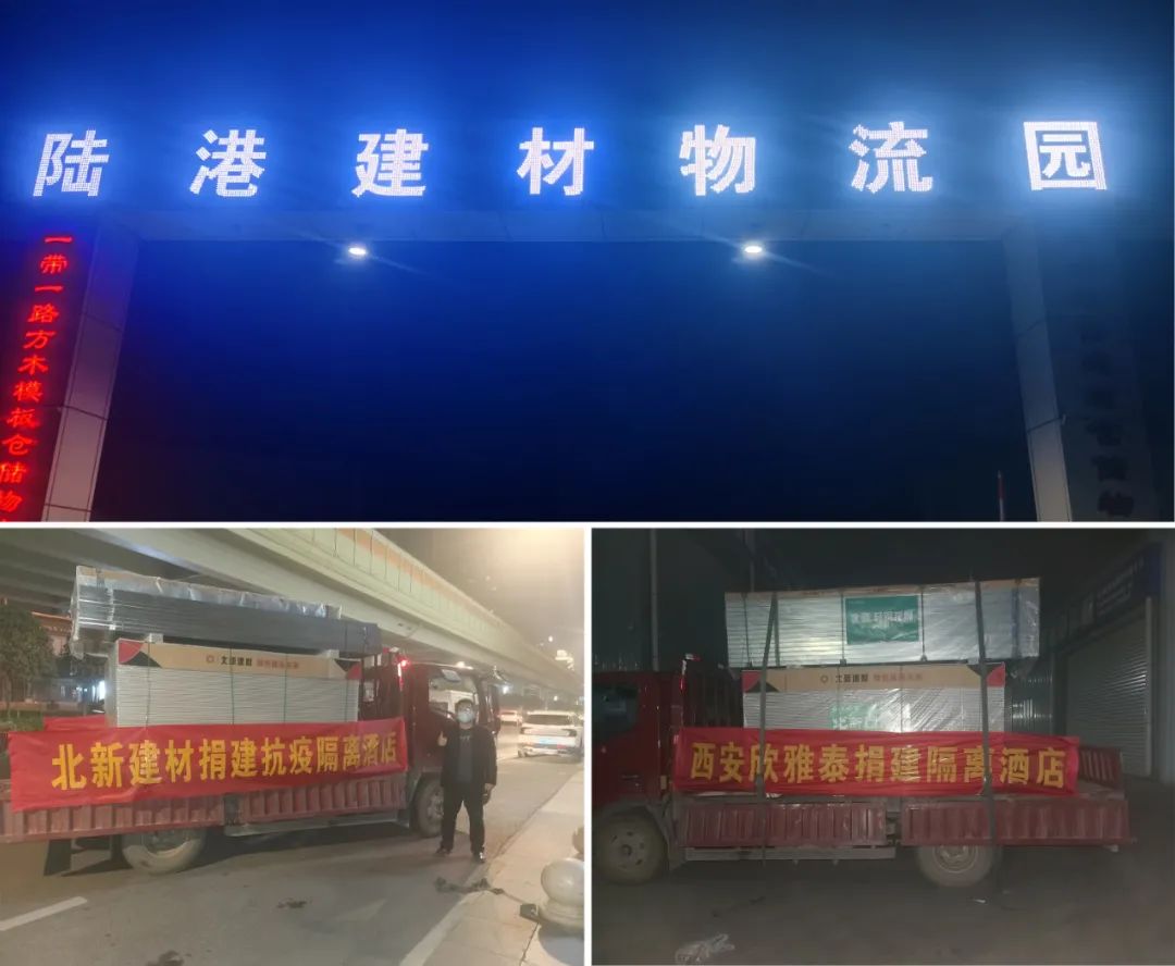 疫情就是命令,北新建材西北公司立即成立捐建工作小组,西北公司战略营销部总经理何亚东与经销商西安欣雅泰商贸有限公司积极配合,克服重重困难,联系车辆,从已经封闭的建材市场调配物资。经过3个小时的协调与装运,在社会各个环节的配合与支持下,晚上8时第一批龙牌石膏板轻钢龙骨等援助物资运抵项目现场,保障陕西建工集团连夜施工,为抗疫隔离酒店改造建设提供有力支持。