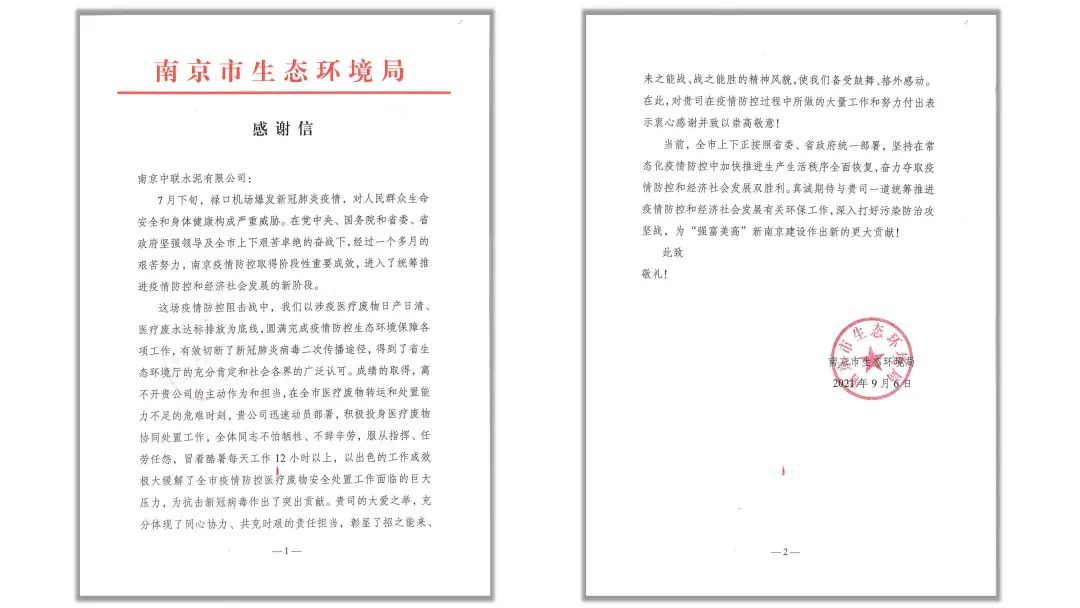 “贵司的大爱之举,充分体现了同心协力、共克时艰的责任担当,彰显了招之能来、来之能战、战之能胜的精神风貌,使我们备受鼓舞、格外感动。在此,对贵司在疫情防控过程中所做的大量工作和努力付出表示衷心感谢并致以崇高敬意!”这是南京市生态环境局于2021年9月6日给予南京中联水泥有限公司的一封感谢信。