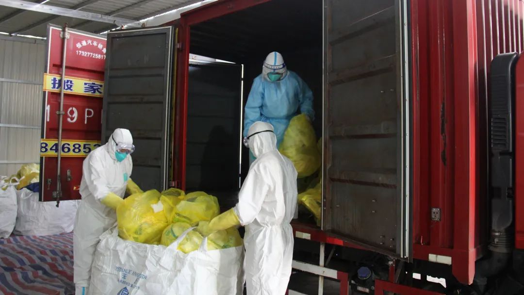 “危废物来的量很大,一车接一车,有用于核酸检测的试剂盒、棉签、废弃的口罩、防护服等医疗废物,还有大量的隔离区餐食垃圾。”