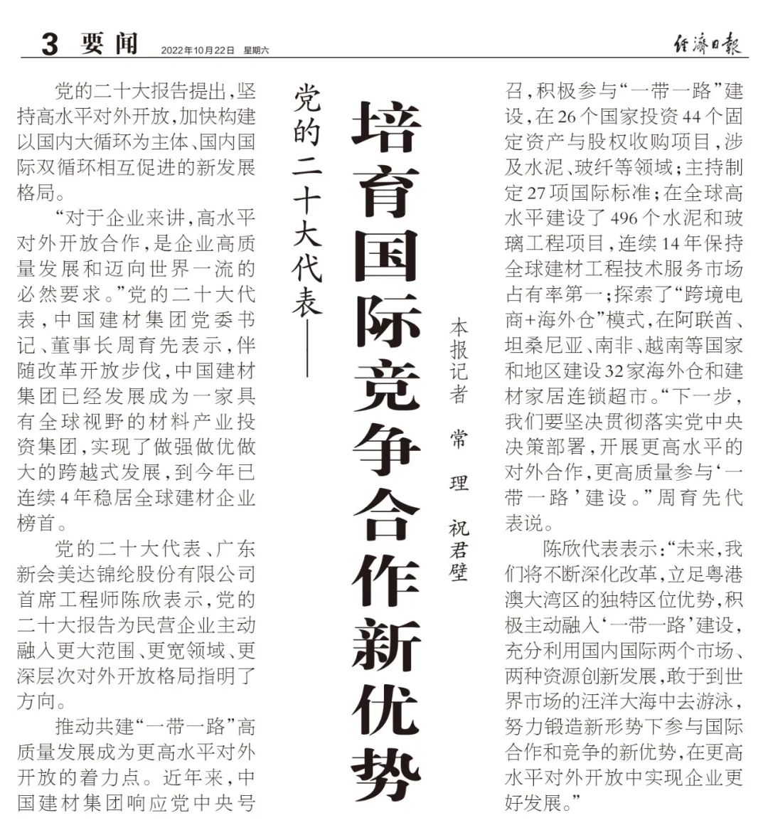 响应党中央号召,积极参与“一带一路”建设,在26个国家投资44个固定资产与股权收购项目,涉及水泥、玻纤等领域;主持制定27项国际标准;在全球高水平建设了496个水泥和玻璃工程项目,连续14年保持全球建材工程技术服务市场占有率第一;探索了“跨境电商+海外仓”模式,在阿联酋、坦桑尼亚、南非、越南等国家和地区建设32家海外仓和建材家居连锁超市。“下一步,我们要坚决贯彻落实党中央决策部署,开展更高水平的对外合作,更高质量参与‘一带一路’建设。”周育先代表说。 多家媒体对周育先代表进行访谈 在中国新闻社《破题新时代人才“考卷” 代表有话说》中说道: 中共二十大代表,彩票论坛