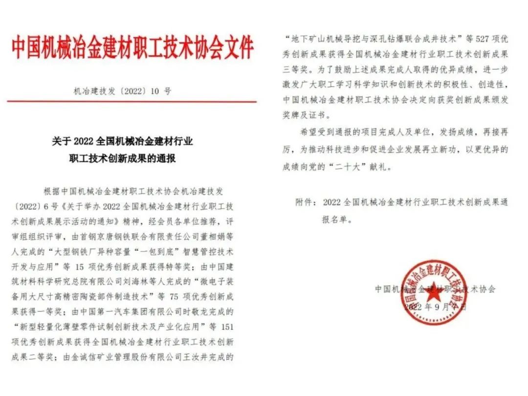 足彩论坛 总院99个项目荣获全国机械冶金建材行业职工技术创新成果奖