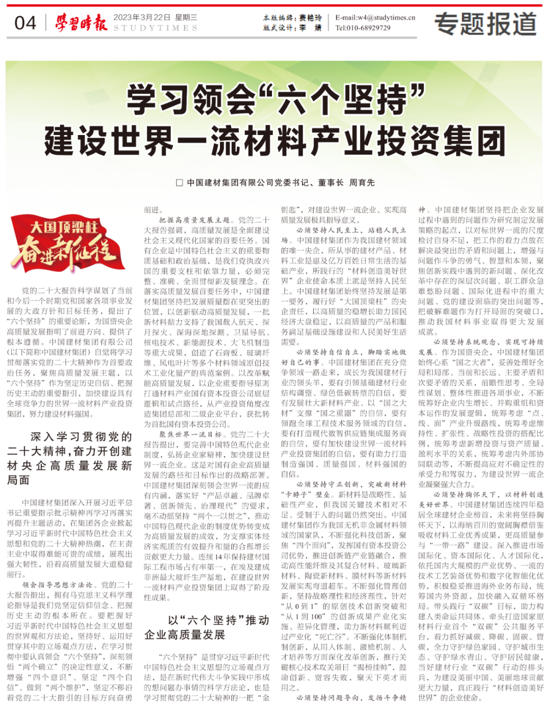 党委书记、董事长周育先署名文章。文章聚焦高质量发展主题,以“六个坚持”科学方法论指引我们加快建设世界一流材料产业投资集团,努力建设材料强国。