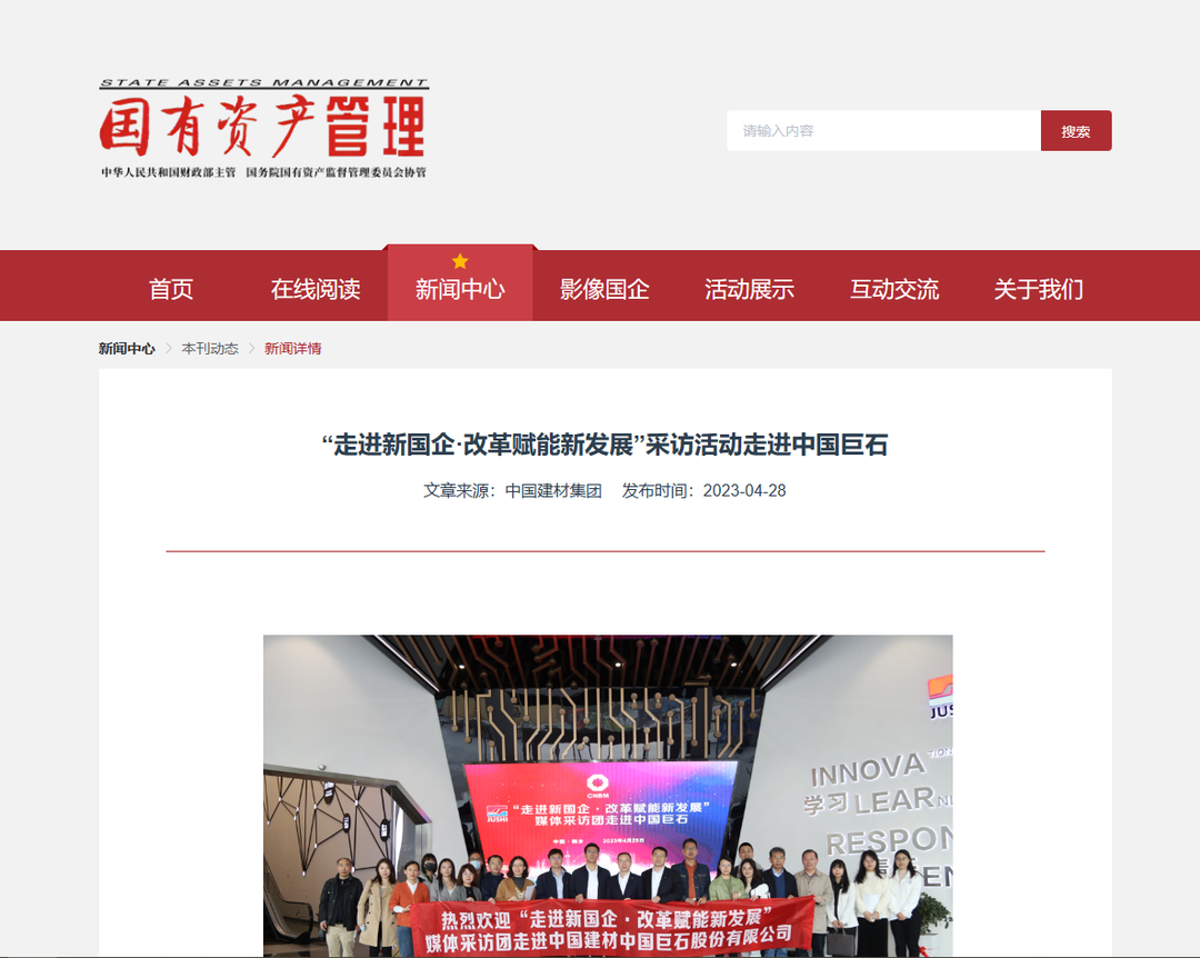 来源:国资委官方网站、经济日报、科技日报、中国青年报、工人日报、中国证券报、第一财经、国有资产管理杂志、环球网 发布时间:2023-06-07近日,国资委宣传局、足彩新闻 联合组织“走进新国企·改革赋能新发展”大型融媒采访活动走进足彩论坛 ,国资委改革办、国资委研究中心专家和十多家中央权威主流媒体记者实地探访了中国巨石,参观了玻纤智能制造基地、智慧展示中心以及巨石成立三十周年成果展,纷纷报道点赞我们先进的玻纤生产技术、智能的制造流程、丰富的产品种类、广泛的应用领域。