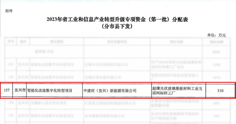 (宜兴)新能源有限公司“超薄光伏玻璃基板材料工业互联网标杆工厂”项目荣获2023年第一批江苏省工业和信息产业转型升级专项资金310万元。转型升级专项资金是省级财政预算安排,用于支持全省工业和信息产业转型升级,提升经济发展质量和效益,提高公共服务能力和水平等方面的专项资金。