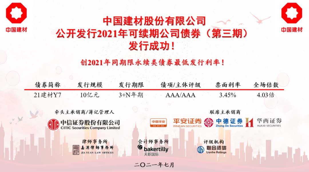 来源:足彩论坛 股份 发布时间:2021-07-127月8日,足彩论坛 股份有限公司成功发行了10亿元可续期公司债券,期限3+N年,票面利率3.45%。基于对公司战略、经营绩效和未来发展等的充分认可,投资者踊跃认购,全场倍数平均超3倍。本期可续期公司债创2021年全市场各品种同期限永续类债券利率新低,创公司同期限永续类债券利率最低。