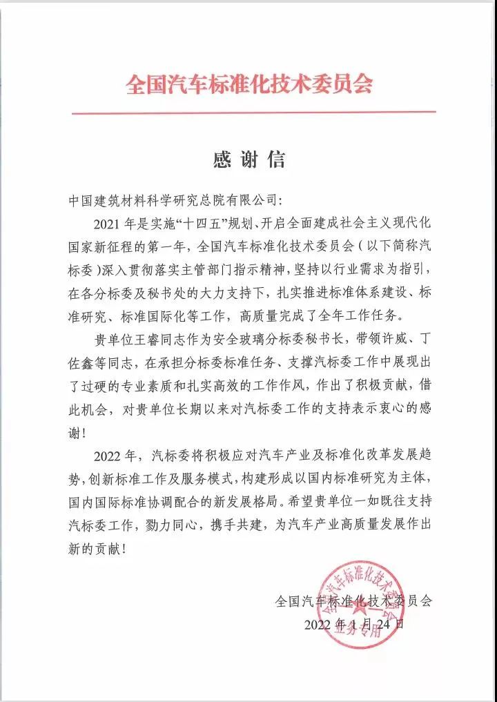 近日,全国汽车标准化技术委员会发来感谢信,对国检集团在承担全国汽车标准化技术委员会工作中做出的积极贡献予以感谢和表扬,对国检集团玻璃检验认证院王睿、许威、丁佐鑫等优秀个人在支撑全标委工作中展现出过硬的专业素质和扎实高效的工作作风予以表扬。