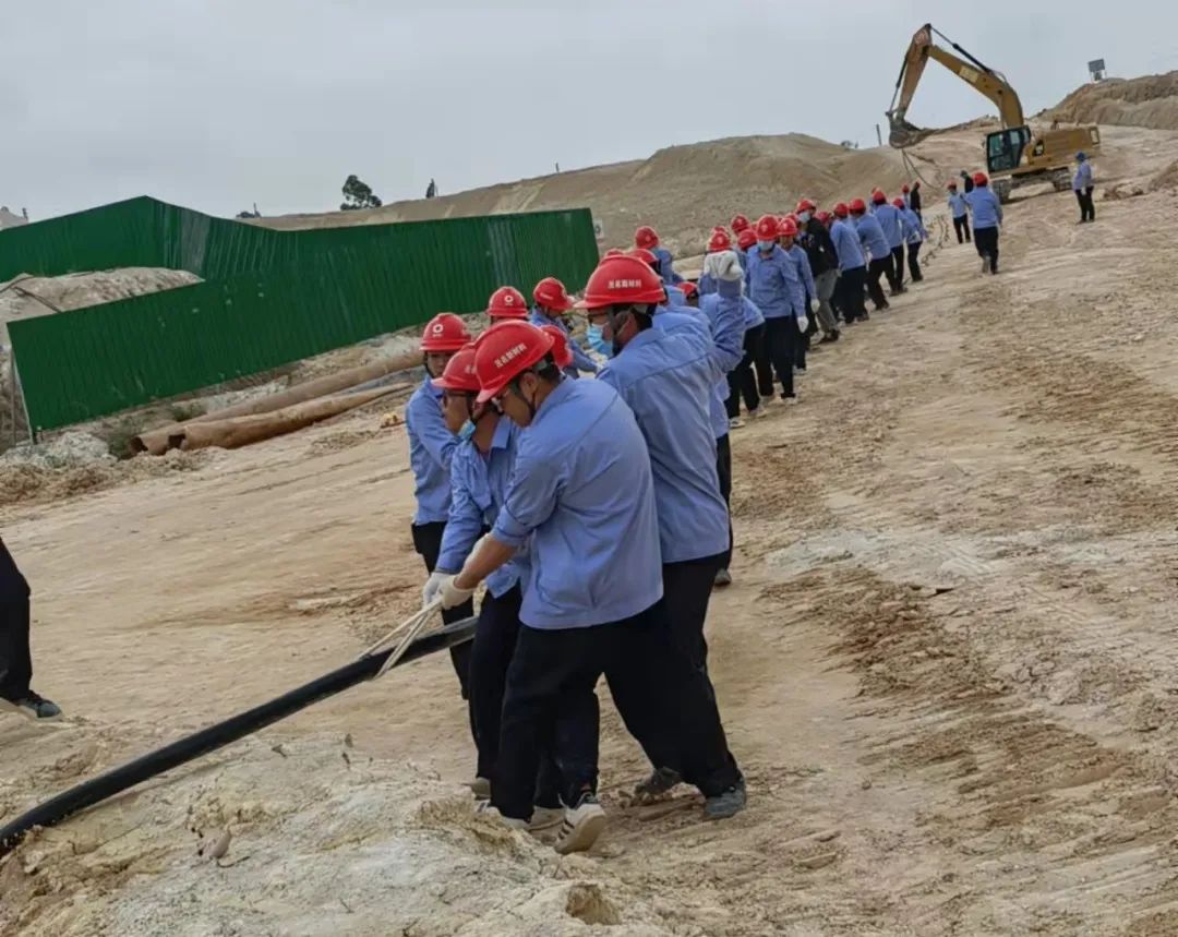 年产60万吨高岭土材料工程项目收尾工作正如火如荼进行中。几百名建设者奋战在项目施工一线,按下建设“加速键”。轰鸣的机器、撸起的袖子、齐声的吆喝……在茂名新材料分离站浮坞泵站施工现场,伴随着“一二三,一二三”的响亮口号,放电缆、拉电缆、搬运电缆、敷设入槽等各个环节紧张有序地进行着,由于电缆敷设长度长、重量重,敷设时非常吃力,电缆只能一点一点地向前挪动,在酷热的天气下,汗水浸湿了员工们的工作服,但是工人们不怕苦、不怕累,心往一处想、劲往一处使,长达1480米的电缆终于敷设到位。每天晚上,车间灯火通明,道路雏形初现,工程车辆车水马龙......到处可见机欢人忙的施工场景,这样一幅幅动人的劳动场景震撼人心,令人动容。“黄沙百战穿金甲,不破楼兰终不还,咱们工人有力量”,茂名新材料人与时间竞速、与工期赛跑,以高昂的斗志、火热的激情,投身大干热潮,以奔跑的姿态推动项目建设跑出“加速度”,用实际行动践行实干担当的精神。