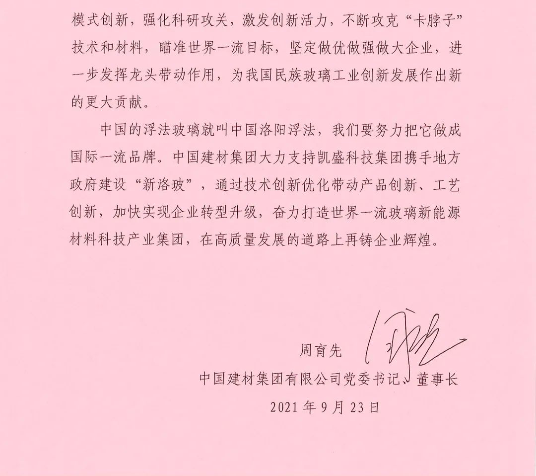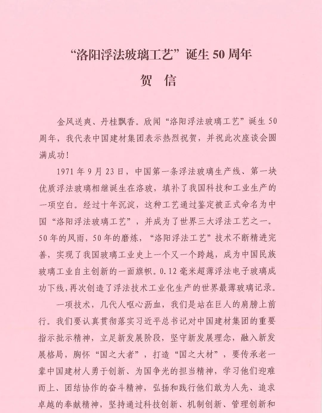 2021年9月23日,洛玻举办了纪念“洛阳浮法玻璃工艺” 诞生50周年座谈会。中国工程院院士、彩票论坛 总工程师、凯盛科技集团董事长彭寿发表寄语,向为“洛阳浮法玻璃工艺”发明和创新发展作出贡献的广大科技工作者表示崇高的敬意和热烈的祝贺。同时,表示“洛阳浮法玻璃工艺”是民族玻璃工业发展壮大的核心技术,是传统玻璃向新材料转型的关键技术。自力更生、自主创新、产业报国、勇于奉献是“洛阳浮法玻璃工艺”与生俱来的品质,希望广大玻璃科技工作者心怀“国之大者”,始终保持“关键核心技术要不来、买不来、讨不来”的紧迫感,始终保持“玻璃创造美好世界”的使命感,始终保持建设科技强国、材料强国的责任感,万众一心、同心协力,为国家玻璃工业实现高水平科技自立自强奋勇前进!