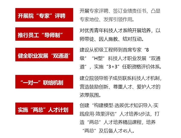 秉持“院士、专家、工程师、工匠” 四层级人才培养思路 召开人才工作会议 发布“人才激励十条” 强化科技人才队伍建设 持续健全中长期激励体系 改革成果荣获 国有企业深化改革实践优秀案例一等奖 全国足彩文化优秀成果 全国足彩文化建设最佳实践企业 全国企业管理现代化创新成果二等奖 行业、省级企业管理现代化创新成果一等奖等荣誉 南京玻纤院人才工作会议 01. 重视科技人才职业通道建设 南京玻纤院“专家”选聘评审会 南京玻纤院“两总”及后备人才培训班 02. 推动产业工人队伍建设改革 打造“双师型”人才队伍 成立江苏玻纤产业工匠学院 劳模(工匠)创新工作室联盟 主办全省玻纤及制品检验工 职业技能竞赛 培养院技能人才529名 “双师型”人才26名 获全国技术能手2人 全国建材工匠1人 全国纺织大工匠1人 江苏省五一劳动奖章4人 其他荣誉奖项近20人 阶段成果 在《工人日报》《新华日报》 《学习强国》媒体报道 南京玻纤院“培—鉴—竞—用”技能型人才管理体系 共建成立江苏玻纤产业工匠学院 “江苏工匠”岗位练兵及玻纤及制品检验工职业技能竞赛 03. 优化科技人才薪酬激励机制 重视科技人才激励体系建设 强化正向激励 激发内生活力 推动落实 重大项目薪酬总额单列激励 建立实施 科技类专项奖励 形成3大类、12项激励措施 为内容的多样化特色激励体系 南京玻纤院差异化薪酬管理体系 南京玻纤院薪酬总额管控动态管理机制 南京玻纤院试点重大项目薪酬总额单列 释放创新活力 发展再创新高 “十四五”以来 南京玻纤院通过国企改革行动和创新发展举措 企业呈现新气象、迸发新活力 综合实力和经营效益 不断迈上新台阶 在国资委2022年度 科改企业考核中获评优秀 改革再启程 踔厉奋发向前 快马加鞭未下鞍 撸起袖子加油干 南京玻纤院将以习近平新时代 中国特色社会主义思想为指导 深入贯彻落实党的二十大精神 深入开展国企改革深化提升行动 以科改行动为契机 围绕“四个面向” 突出战略重点 以改革促发展,以创新求实效 切实强化核心竞争力和核心功能建设 不断塑造发展新动能新优势 推动高质量发展!
