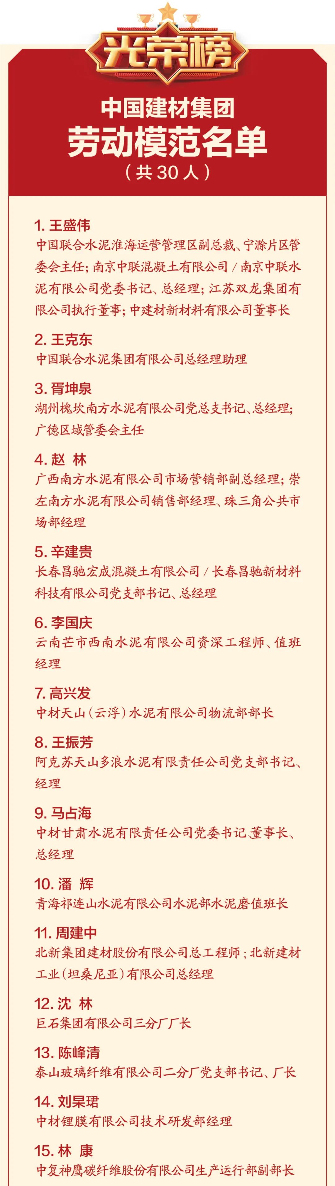 来源:集团工会 发布时间:2021-05-072021年是“十四五”规划的开局之年,也是中国共产党成立100周年,为大力弘扬劳模精神、劳动精神、工匠精神,进一步调动广大干部职工的积极性和创造性,不断增强“四个意识”、坚定“四个自信”、做到“两个维护”,坚持围绕中心,服务大局,为集团改革发展作出积极贡献,集团工会决定授予王盛伟等30人“彩票论坛 劳动模范”荣誉称号,授予中国联合水泥集团有限公司运营中心等50个基层单位“彩票论坛 先进集体”荣誉称号。