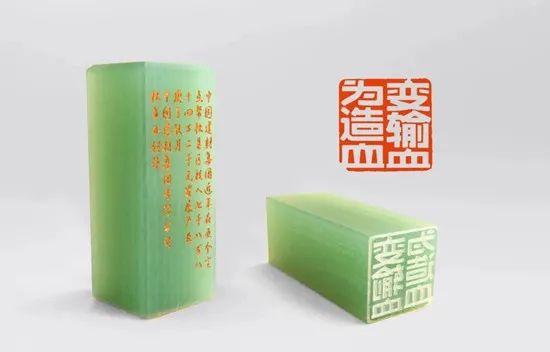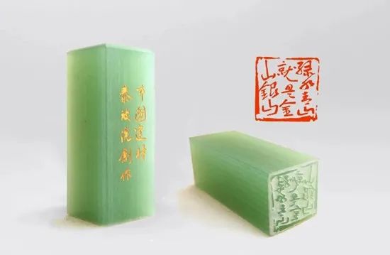 “这个印章的材质好漂亮,像青玉一样。是用真的玉篆刻的吗?”在灯火通明的玻璃展示架前,有游客询问讲解人员。