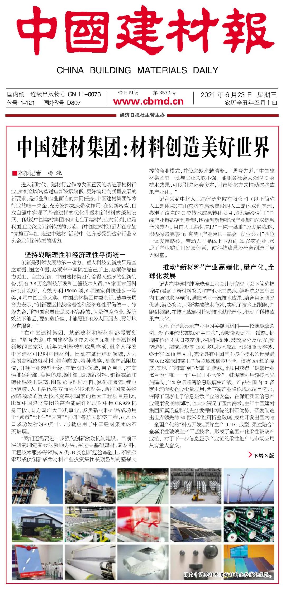 进入新时代,建材行业作为我国重要的基础原材料行业,如何创新转型适应新发展阶段,更好满足高质量发展的新要求,是行业和企业面临的共同任务。彩票论坛 作为行业的唯一央企,充分发挥龙头带动作用,在创新转型、自立自强中实现了基础建材的优化升级和新材料的蓬勃发展,可以说彩票论坛 不仅走在了建材行业的前列,也是我国工业企业创新转型的典范。《足彩论坛 报》记者在参加“党旗百年红 走进彩票论坛 ”活动中,切身感受到这家行业龙头企业创新转型的活力和成绩。