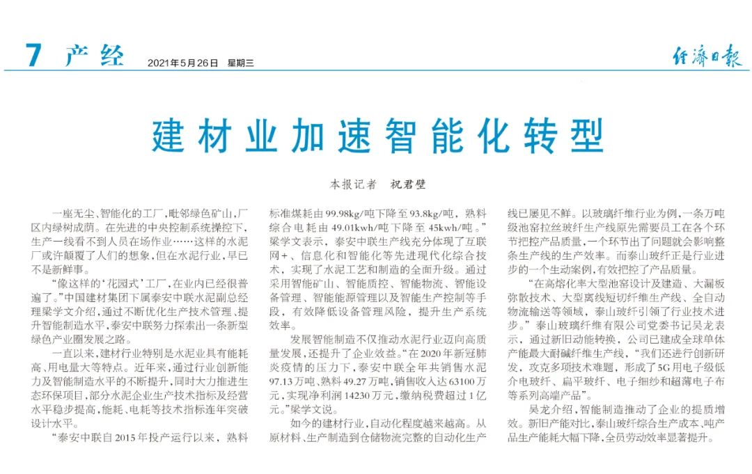 《经济日报》“走进彩票论坛 ” ,报道建材业加速智能化转型 | 泰安站