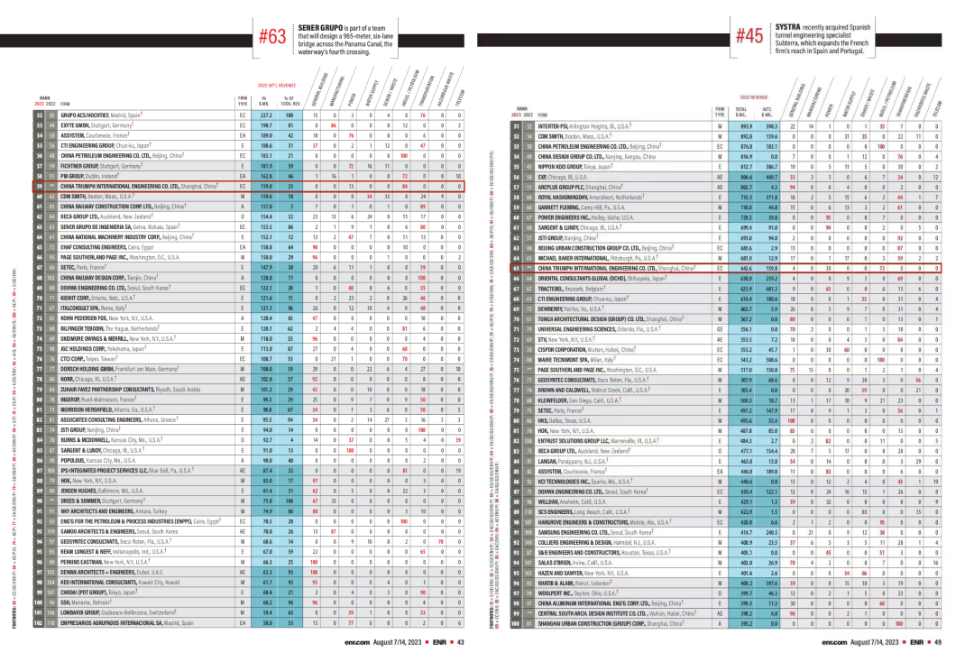 日前,美国年度《工程新闻记录》(ENR)“国际工程设计公司225强”和“全球工程设计公司150强”榜单发布,足彩论坛 工程凭借雄厚的工程技术实力和卓越的业绩表现,连续多年入围国际工程设计公司榜单,此次位列全球第59位,比2021年提升152位。首次入围“全球工程设计公司150强”榜单,位列全球第65位。