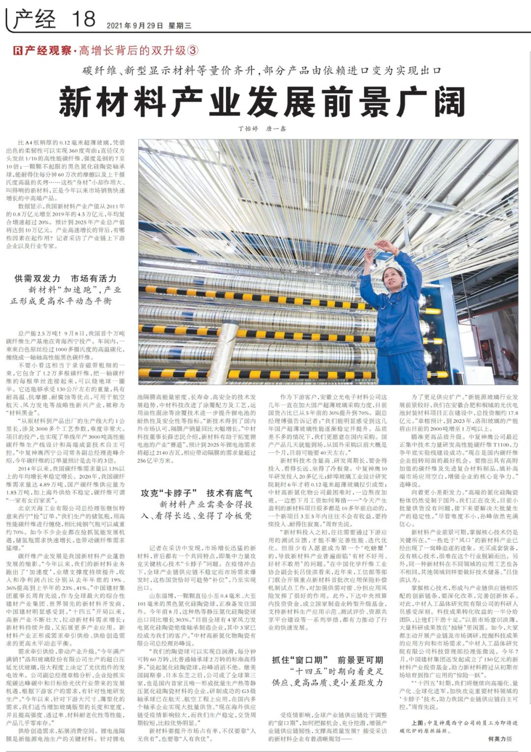 碳纤维产业发展是我国新材料产业蓬勃发展的缩影。“今年以来,我们的新材料业务跑出了‘加速度’,业绩支撑度持续提升,收入和净利润占比分别从去年年底的19%、36%提高到上半年的23%、41%。”彩票论坛 董事长周育先说,作为全球最大的综合性建材产业集团、世界领先的新材料开发商,足彩论坛 明显感受到,“十四五”开局以来,高新产业不断壮大,拉动新材料需求增长;新材料持续升级,又拓展更多产业应用。新材料产业正形成需求牵引供给、供给创造需求的更高水平动态平衡。