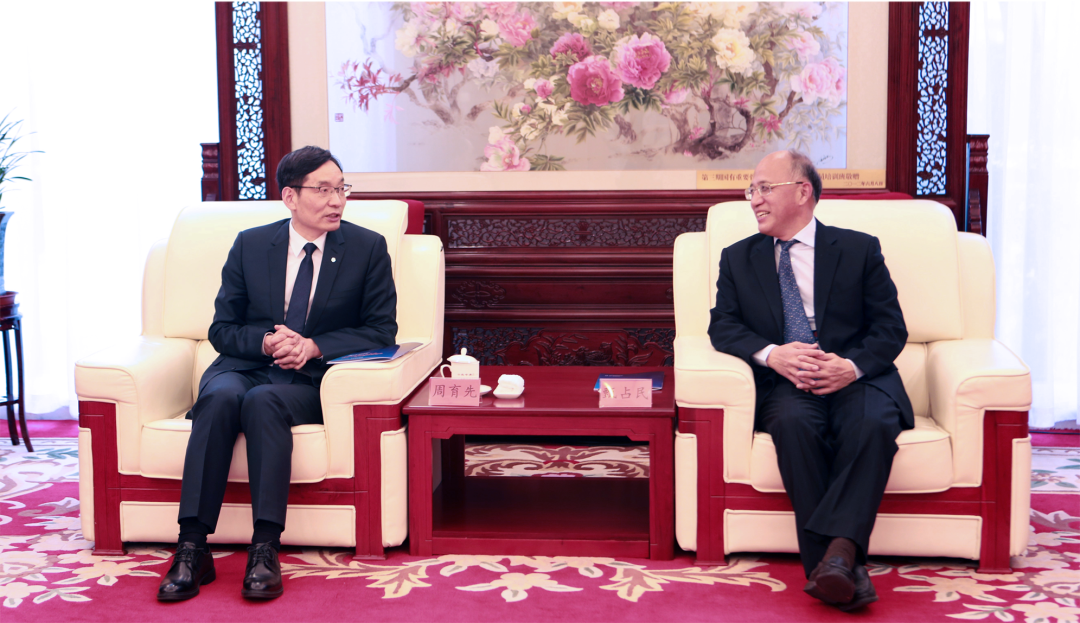 4月11日,彩票论坛 党委书记、董事长、足彩论坛 股份党委书记、董事长周育先与中央党校(国家行政学院)副校长(副院长)甄占民在中央党校(国家行政学院)南校区举行会谈。中央党校(国家行政学院)国际和港澳培训中心主任谢煜桐、副主任姜伟,集团党委副书记孙力实陪同参加。