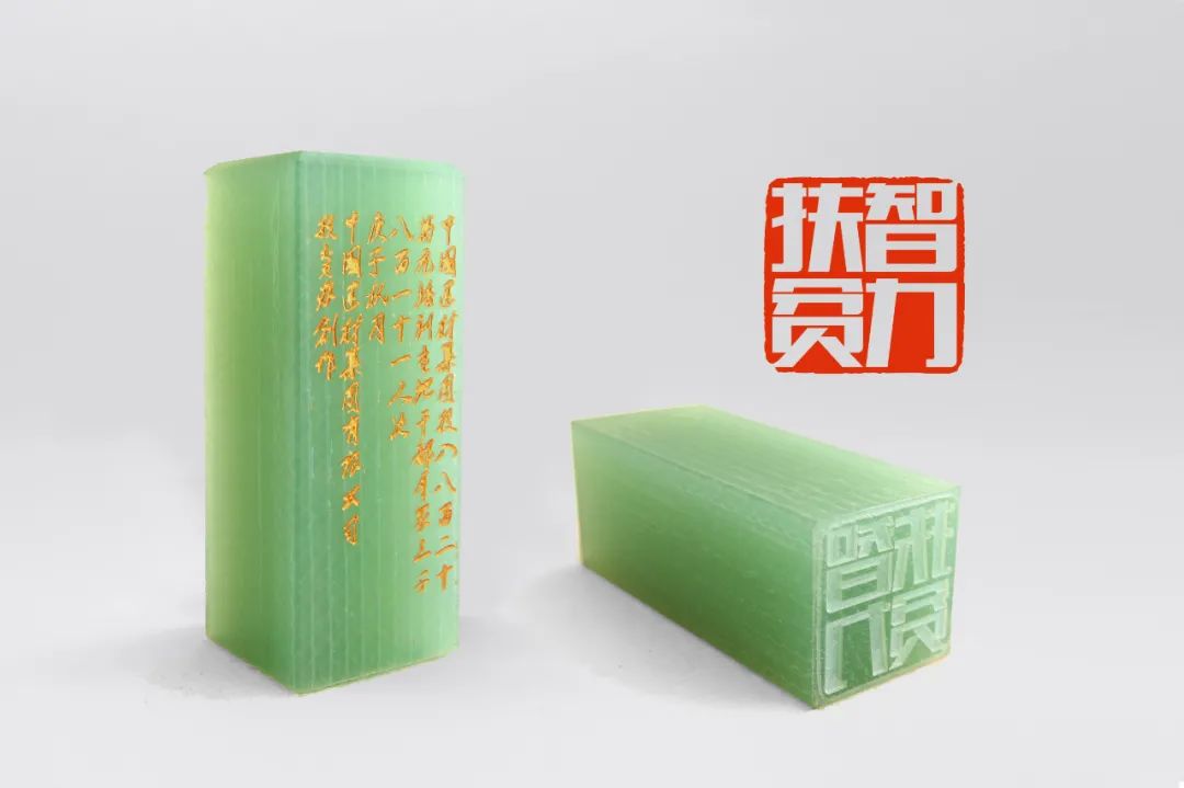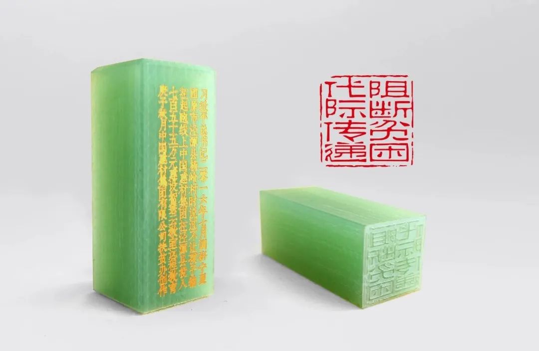 材质说明:以玻璃纤维和环氧树脂为材质,将现代科技与传统文化相融合,采用真空灌注之工艺,精工打磨,制成此印章。表面光润,色泽温和,晶莹剔透,宛若玉石,同时,结构细密,不易破损。