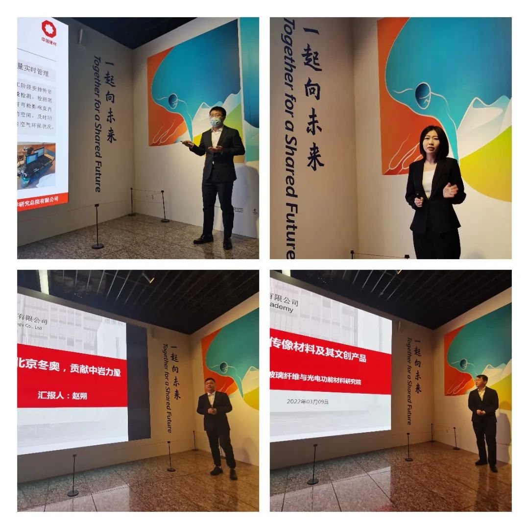 总院所属国检集团裴一朴做了题为《国检集团以专业品质助力绿色冬奥》的专题分享;中岩科技赵朔做了题为《助力北京冬奥,贡献中岩力量》的专题分享;水泥新材院杨占斌做了题为《助力北京冬奥,一起向未来》的专题分享;玻纤院焦朋做了题为《光纤传像材料及其文创产品》的专题分享,他们讲述了总院用新材料和技术服务助力绿色冬奥的故事。