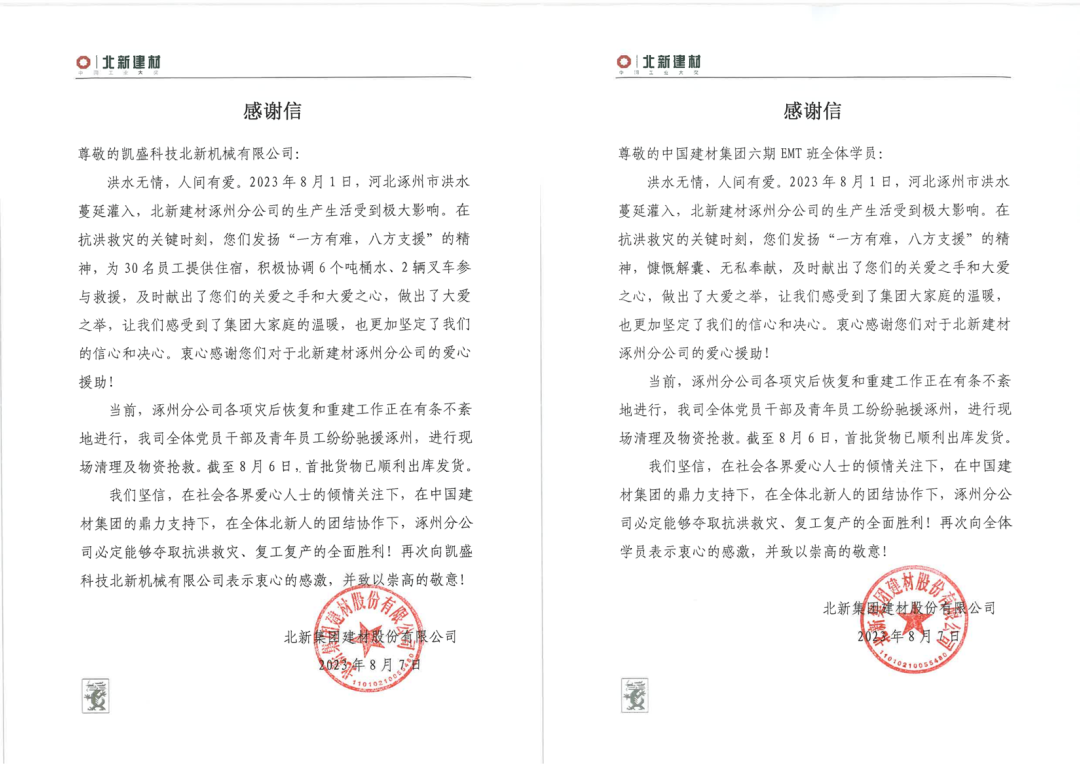 集团兄弟单位伸出援手,北新建材特发感谢信
