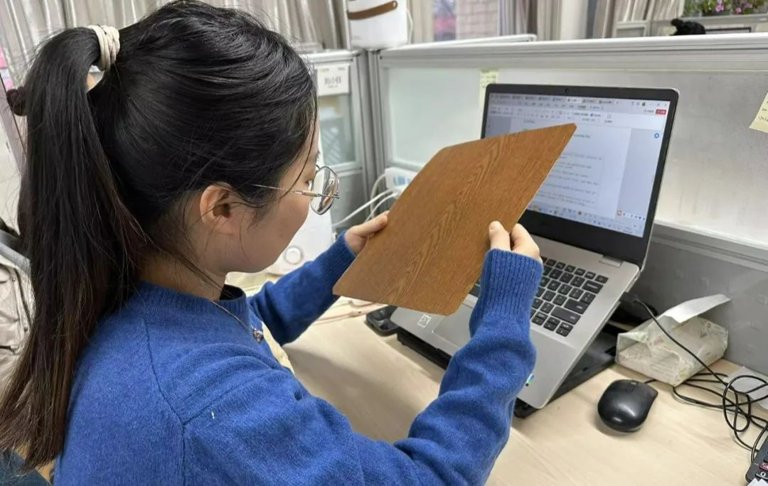 钢材事业部业务员刘小钰收到催促加急的工厂样品快递,为客户确认色样质量。