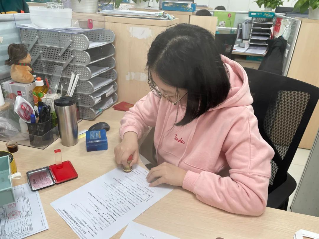 春节期间,依然有很多业务人员奔波在外,而身为财务人员,始终与公司全体员工战斗在一起,他们稳握印章,正在认真核对和加盖,小小的肩膀扛起大大的责任。