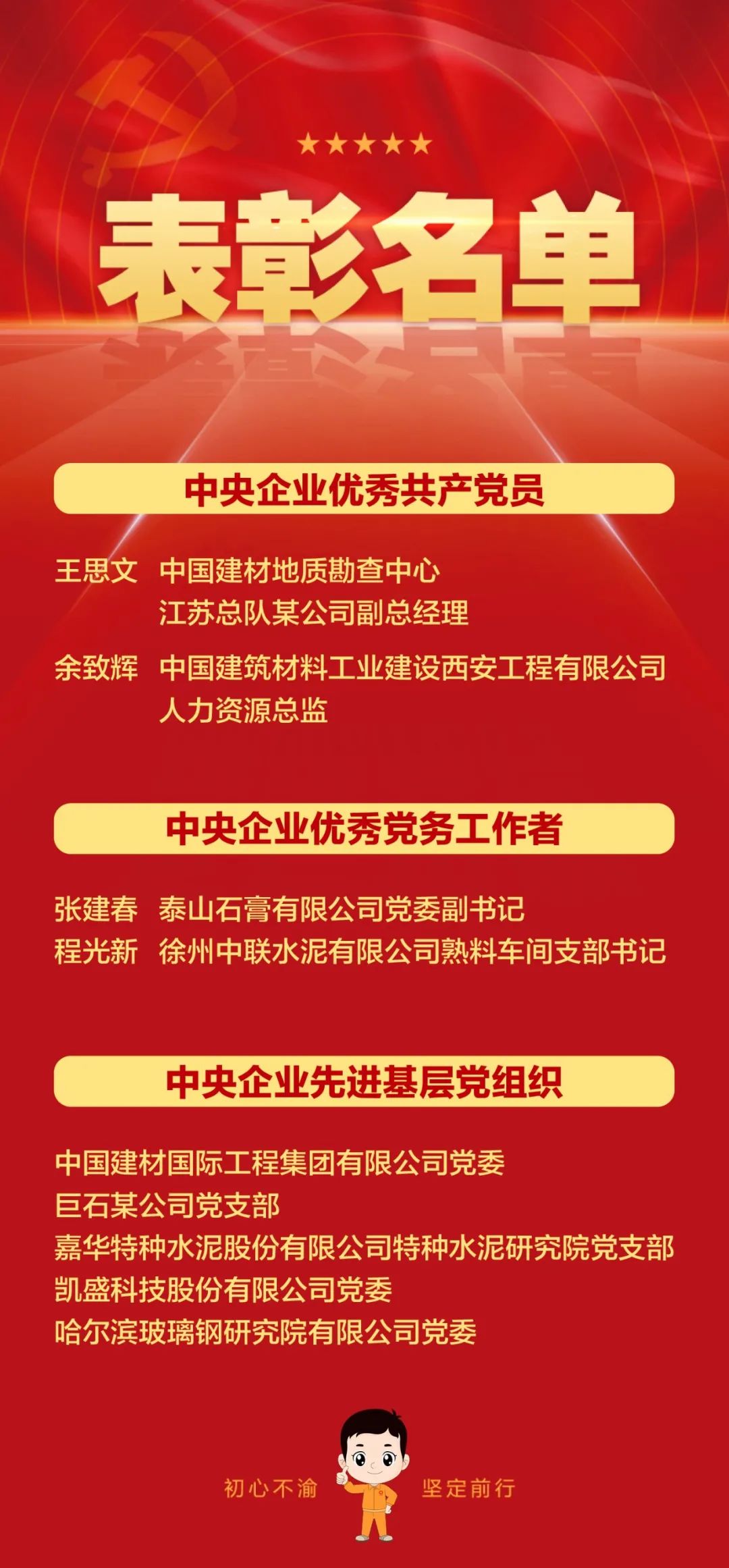 伟大时代呼唤伟大精神,崇高事业需要榜样引领!希望受表彰的优秀个人和先进集体珍惜荣誉、再接再厉,再创新辉煌。希望各级党组织和广大共产党员以受表彰的先进为榜样,增强“四个意识”、坚定“四个自信”、做到“两个维护”,传承红色基因,赓续精神血脉,锐意进取、矢志奋斗,为把集团建设成为世界一流材料产业投资集团作出新贡献!