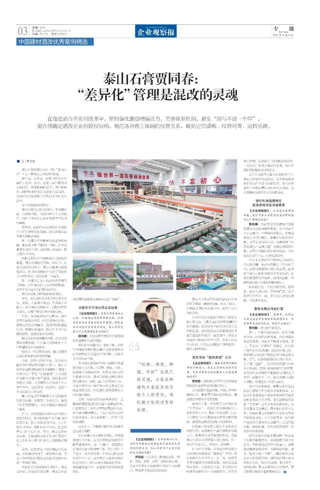 改革亲历者访谈 | 《企业观察报》专访泰山石膏贾同春:“差异化”管理是混改的灵魂