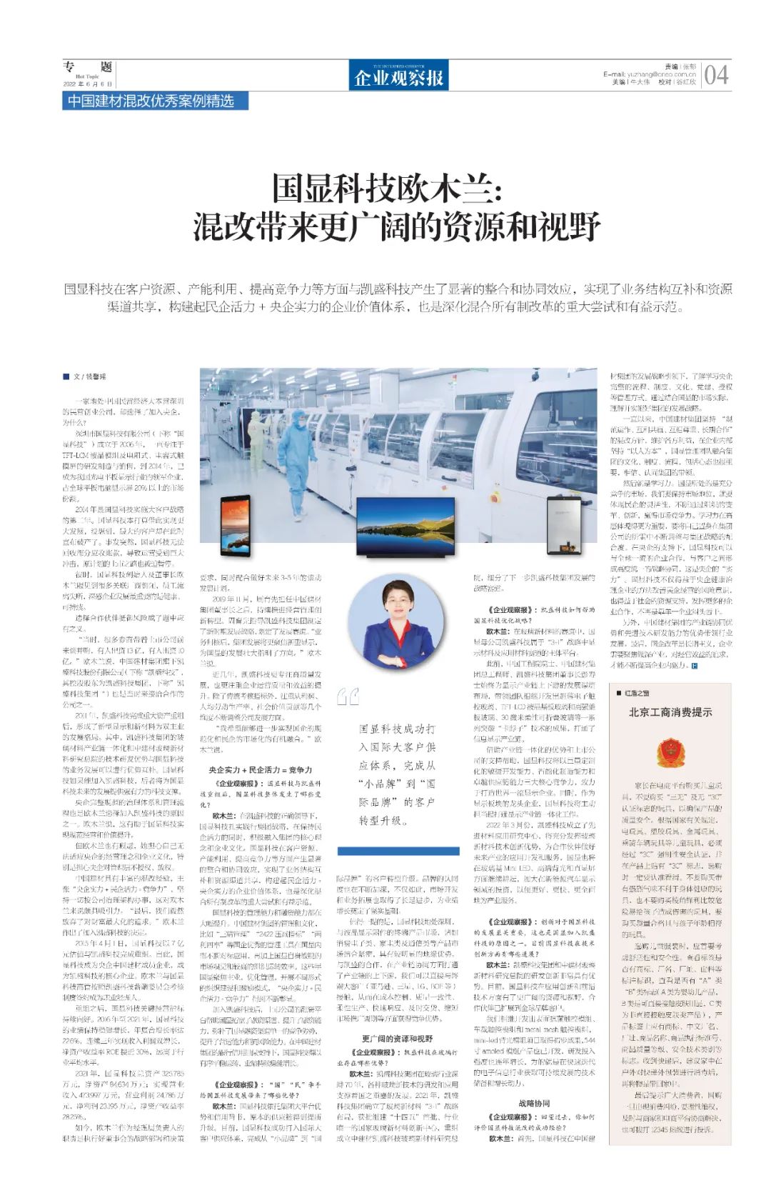 的银行信用担保支持下,国显科技得以有序平稳运转,业绩持续稳健增长。 《企业观察报》:“国”“民”牵手给国显科技发展带来了哪些优势? 欧木兰:国显科技依托集团大平台优势和信用背书,原本的供应链得到提质升级。目前,国显科技成功打入国际大客户供应体系,完成从“小品牌”到“国际品牌”的客户转型升级。品牌的认同度也在不断加深,不仅如此,市场开发和业务拓展也取得了长足进步,为业绩增长奠定了坚实基础。 值得一提的是,国显科技地处深圳,与液晶显示器件的终端产品市场,诸如消费电子类、家电类及通信类等产品市场结合紧密,具有较明显的地缘优势。与凯盛的合作,在产业链协同方面打通了产业链的上下游,我们可以直接与终端大客户(亚马逊、三星、LG、BOE等)接触,从而在成本控制、质量一致性、柔性生产、快速响应、及时交货、缩短市场推广周期等方面获得竞争优势。 02 更广阔的资源和视野 《企业观察报》:凯盛科技在玻璃行业存在哪些优势? 欧木兰:凯盛科技集团在玻璃行业深耕70年,各种玻璃新技术的研发和应用支撑着国之重器的发展。2021年,凯盛科技集团确立了玻璃新材料“3+1”战略布局,获批组建“十四五”首批、行业唯一的国家玻璃新材料创新中心,重组成立彩票论坛