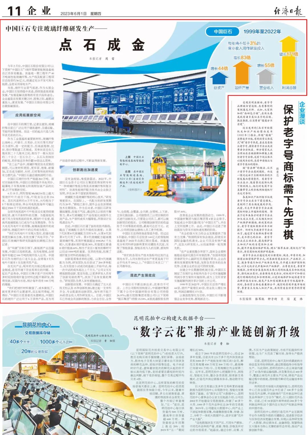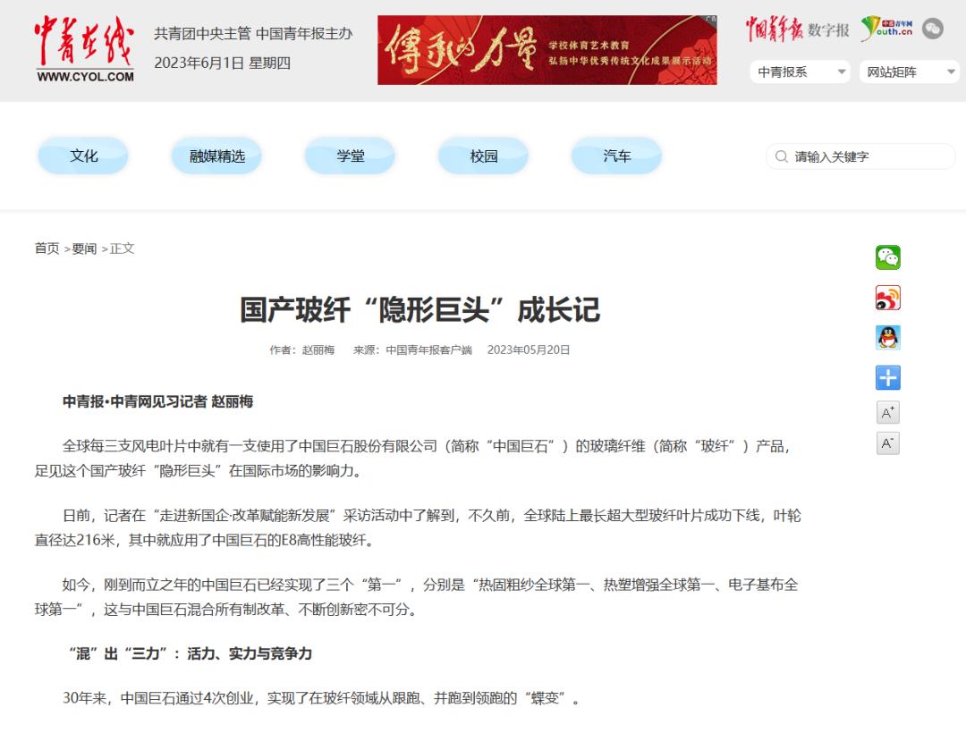 国有资产管理杂志、环球网刊发《“走进新国企·改革赋能新发展”采访活动走进中国巨石》。1999年至2022年,混合所有制改革助力中国巨石经营质量和经营业绩实现跨越式增长,成为了国家混合所有制的典范。迈入新时代,巨石产品研发瞄准市场前沿,不断优化产品结构,以创新布局高端应用领域;把握科技革命大势,全力赋能智能制造,引领玻纤工业数字化变革;国际拓展,打造高质量发展的海外“增长极”;强化绿色生产过程,完善绿色设计理念,实现可持续发展。