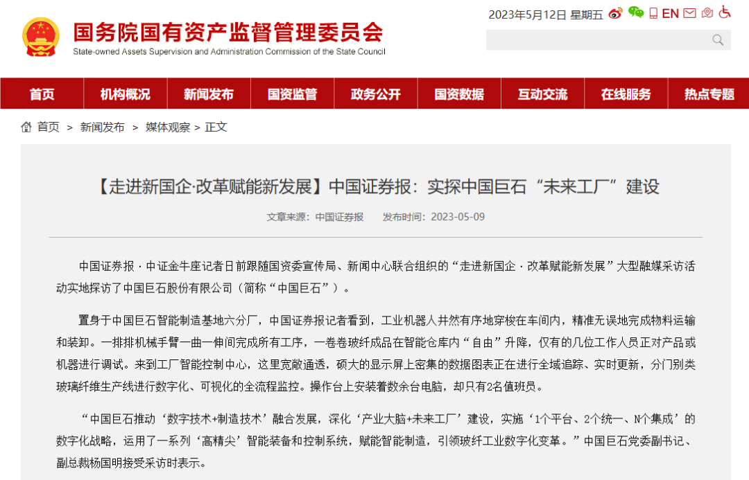 来源:国资委官方网站、经济日报、科技日报、中国青年报、工人日报、中国证券报、第一财经、国有资产管理杂志、环球网 发布时间:2023-06-05近日,国资委宣传局、足彩新闻 联合组织“走进新国企·改革赋能新发展”大型融媒采访活动走进足彩论坛 ,国资委改革办、国资委研究中心专家和十多家中央权威主流媒体记者实地探访了中国巨石,参观了玻纤智能制造基地、智慧展示中心以及巨石成立三十周年成果展,纷纷报道点赞我们先进的玻纤生产技术、智能的制造流程、丰富的产品种类、广泛的应用领域。