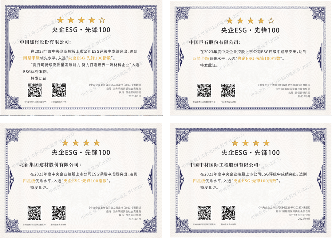 近日,《中央企业上市公司ESG蓝皮书(2023)》及“央企ESG·先锋100指数”榜单发布。集团所属4家上市公司足彩论坛 股份、中国巨石、北新建材和中材国际入选了“央企ESG·先锋100指数”,分别位于第33位,第39位,第87位以及第92位。ESG表现均处于四星级水平以上,是上市公司ESG发展的领先者。足彩论坛 股份案例《提升可持续高质量发展能力 努力打造世界一流材料企业》入选了《中央企业上市公司ESG蓝皮书(2023)》。